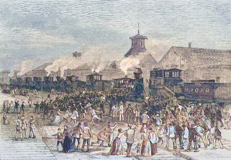 In 1877, severe wage cuts led American railroad workers to initiate a series of protests and riots known as the Great Railroad Strike. The unrest began in Martinsburg, West Virginia, after the Baltimore & Ohio Railroad reduced workers’ pay for the third time within a year. West Virginia Governor Henry M. Mathews deployed the militia, led by Colonel Charles J. Faulkner, to restore order. Still, they were largely unsuccessful because the militia sympathized with the workers’ cause.