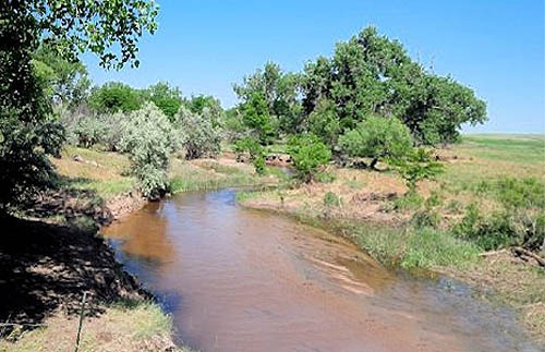 E.D. Boyd: Creek, dry sandy bed 60 yards wide; runs north into the South Fork of Platte River, water by digging two feet; a few willows and cottonwood. |