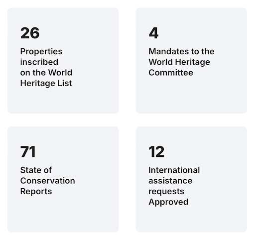 According to the UNESCO report, the country has 26 properties listed in the World Heritage List, four mandates to the World Heritage Committee, and 71 reports on the State of Conservation. The report also cites that it has twelve international assistance requests approved in the amount of $180,809.
