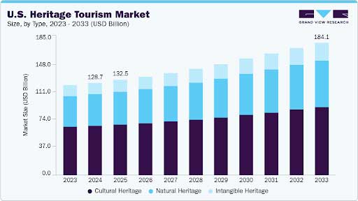 Here’s good news: The U.S. heritage tourism market could grow from $132.5 billion in 2025 to $184.1 billion by 2033 at a 4.2% compound annual growth rate (CAGR).
