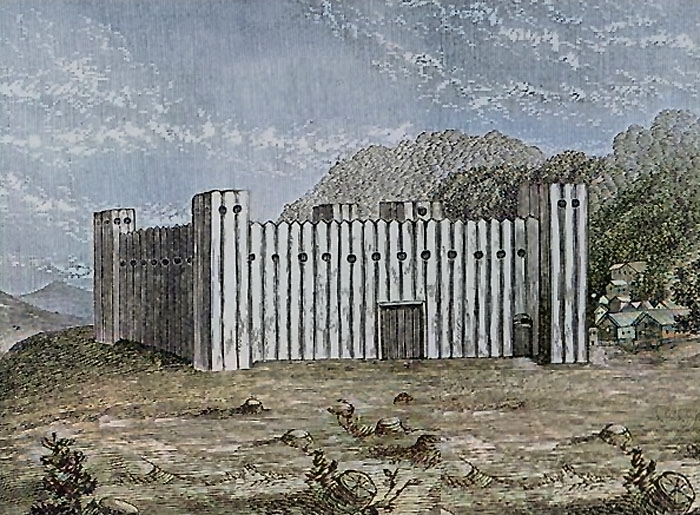 It was built on level ground, and the west side was bordered by a deeply cut bank along the river. The view in all directions from the fort was good. The “stockade” itself was situated back 100 feet or more from the steep riverbank. Once completed in the spring or summer of 1864, the fort contained approximately 20 log houses arranged in a square and enclosed by a log stockade with at least three gated entrances. The structure’s walls and roof were covered with two or three feet of earth. It may have had gun ports.