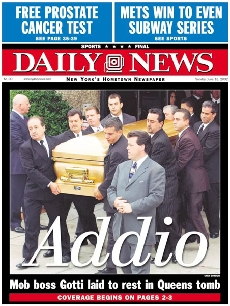 After the funeral, an estimated 300 onlookers followed the procession from Gotti’s Bergin Hunt and Fish Club to the gravesite. Because of his incarceration, Gotti’s brother, Peter, could not attend. In an apparent repudiation of Gotti’s leadership and legacy, the other New York City families sent no representatives to the funeral.