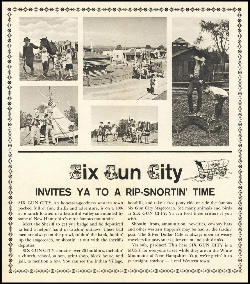 Six-Gun City in Jefferson, New Hampshire, was a Frontier Western-style amusement park that thrilled young cowboys and cowgirls for almost 60 years. Where once there were gunfights, saloons, an Indian Camp, and more, the smoking pistols are gone today.